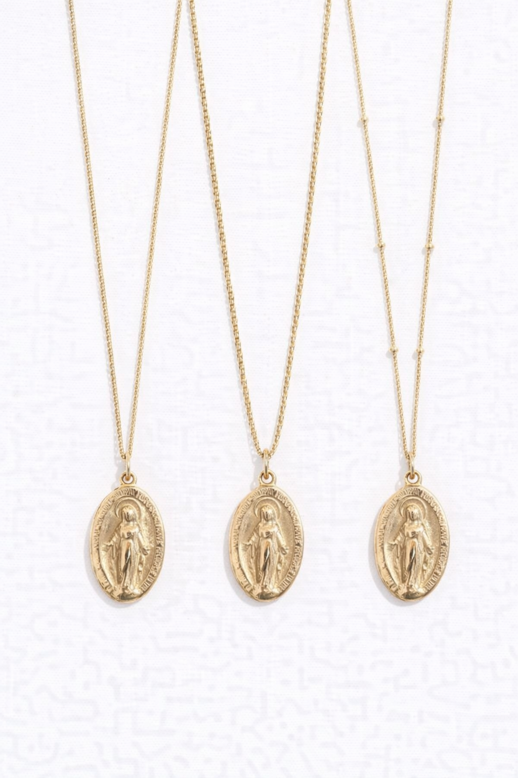 Meet the Mary Pendant. A subtle medallion with delicate religious imagery , this pendant brings a meaningful touch to your jewelry collection with a refined, minimalist design.