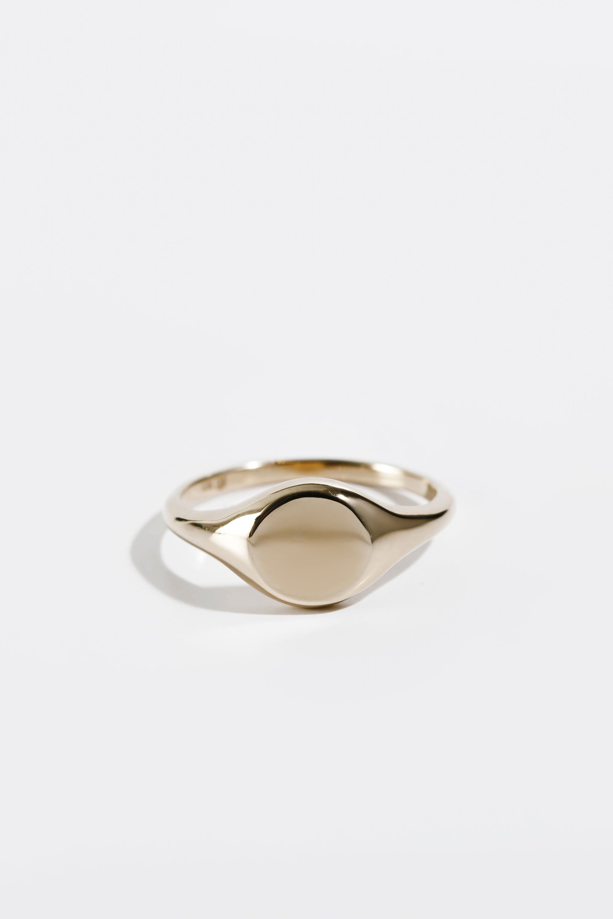 This 10-carat solid gold signet ring features a 10mm round flat face, perfect for engraving a personalized design or initials. With its classic, substantial silhouette, it’s a timeless piece that combines elegance with personal meaning.