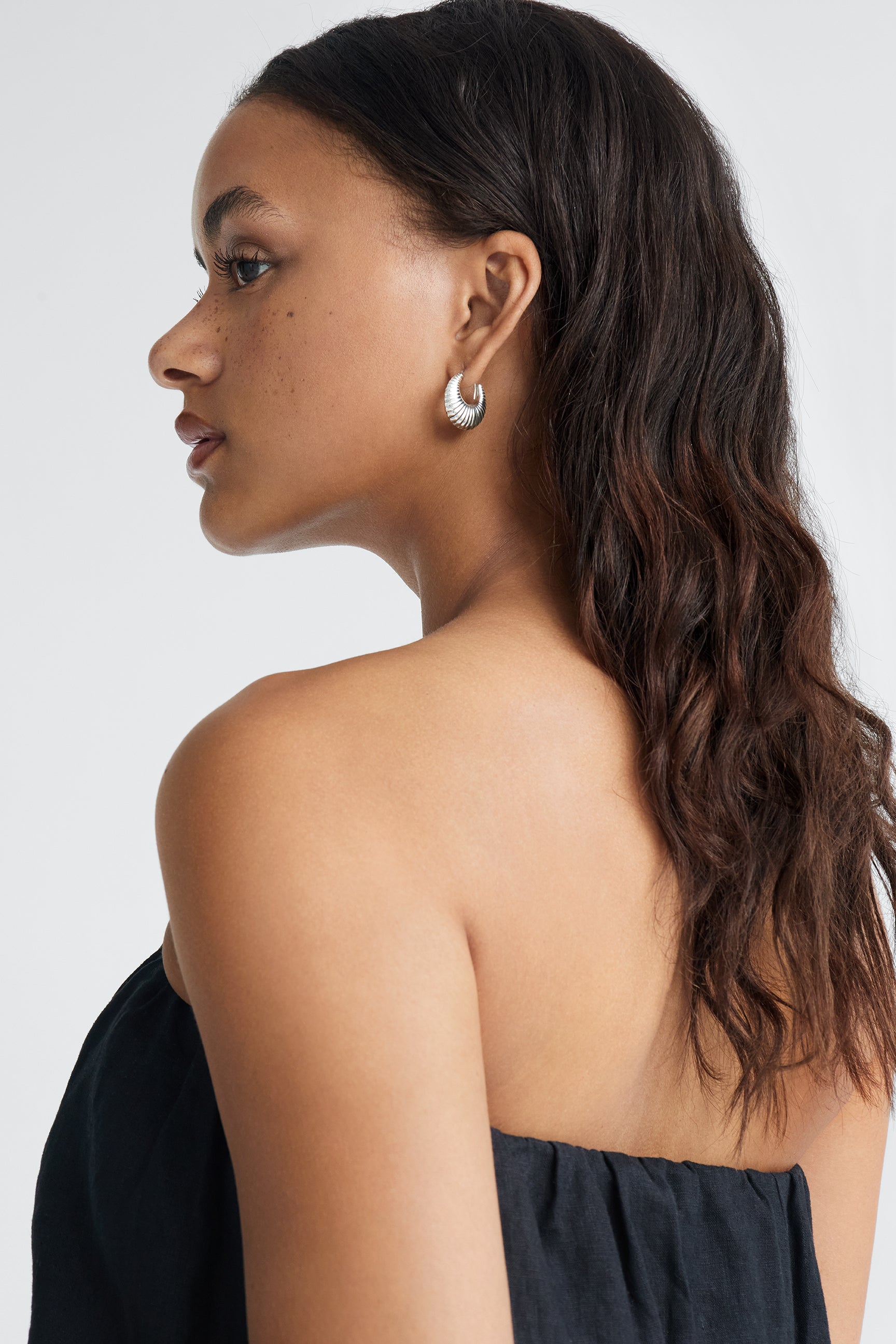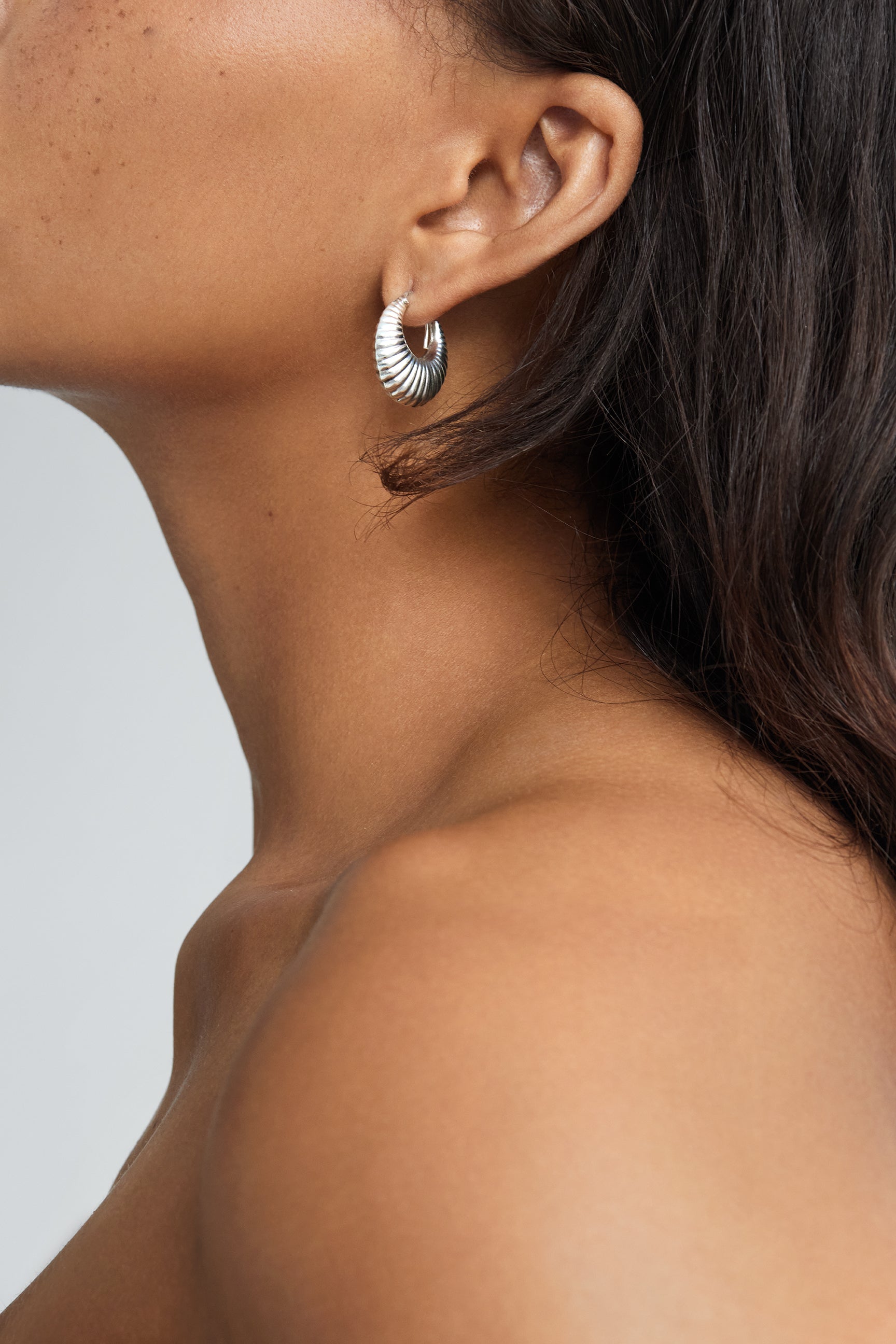 These 22mm sterling silver hoops feature a softly puffed, tapered design with elegant ribbed detailing that catches the light beautifully—perfect for adding subtle texture and shine to any look.